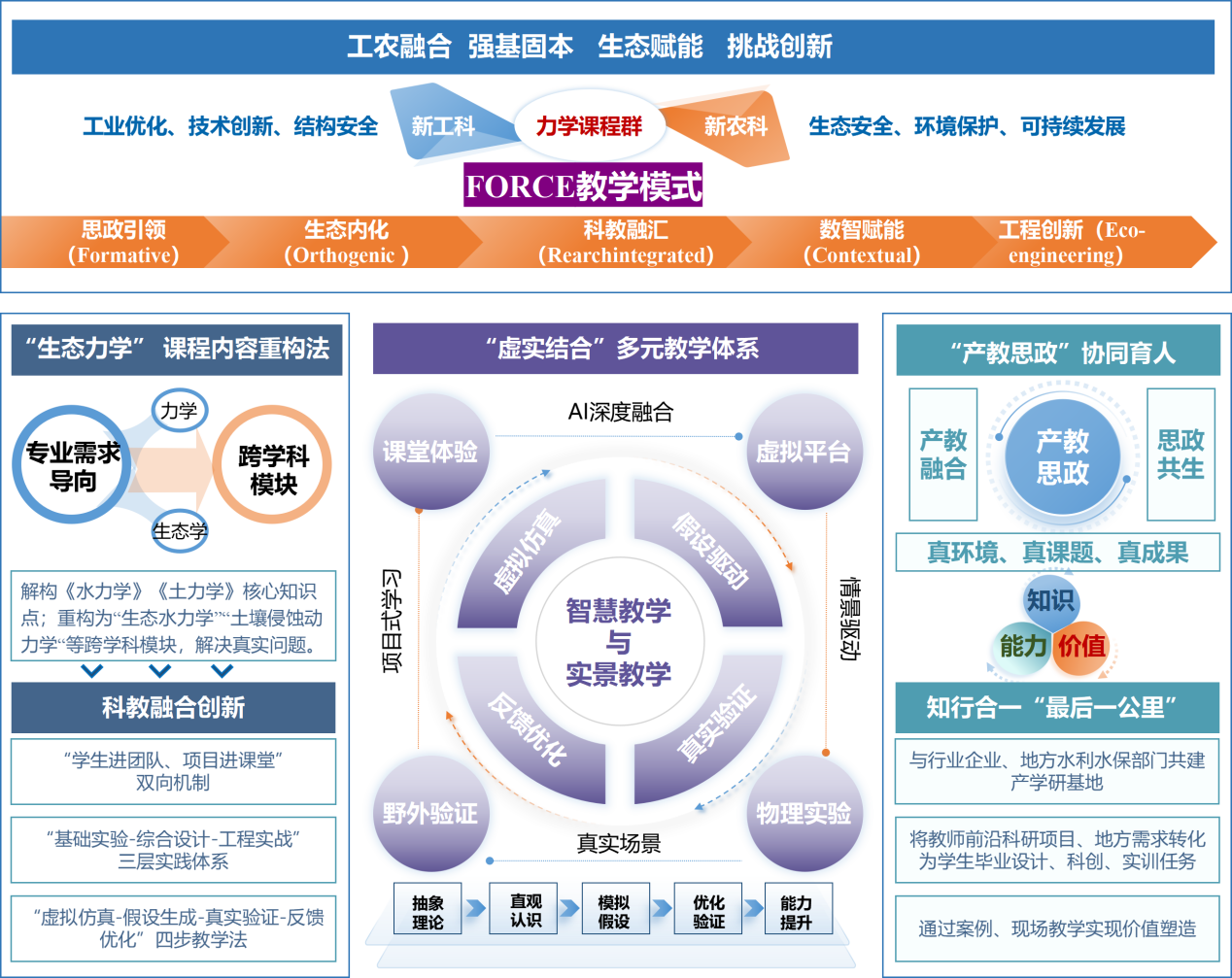 该模式以价值奠基为先导,深入挖掘专业课程中蕴含的“生态保护责任”“科学家精神”“工程伦理”三大思政主题,通过建设系统的课程思政教学体系,实现价值塑造与知识传授的有机统一。以生态导向为核心,重构课程体系,删除传统工业应用模块12个,新增“生态水力学”“土壤侵蚀动力学”等特色模块,推动学科内涵从传统工业应用向现代生态治理全面转型。以科教融汇为支撑,与行业龙头企业、地方水利部门深度合作,将250余项实际工程项目转化为教学资源,形成“基础实验-综合设计-工程实战“三层次实践教学体系。以智慧赋能手段,自主研发AI赋能的力学行为仿真平台,采用数值仿真技术构建20余个高保真实验场景。以工程创新为落脚点,建立覆盖我国主要水土流失类型区的产学研实践基地。