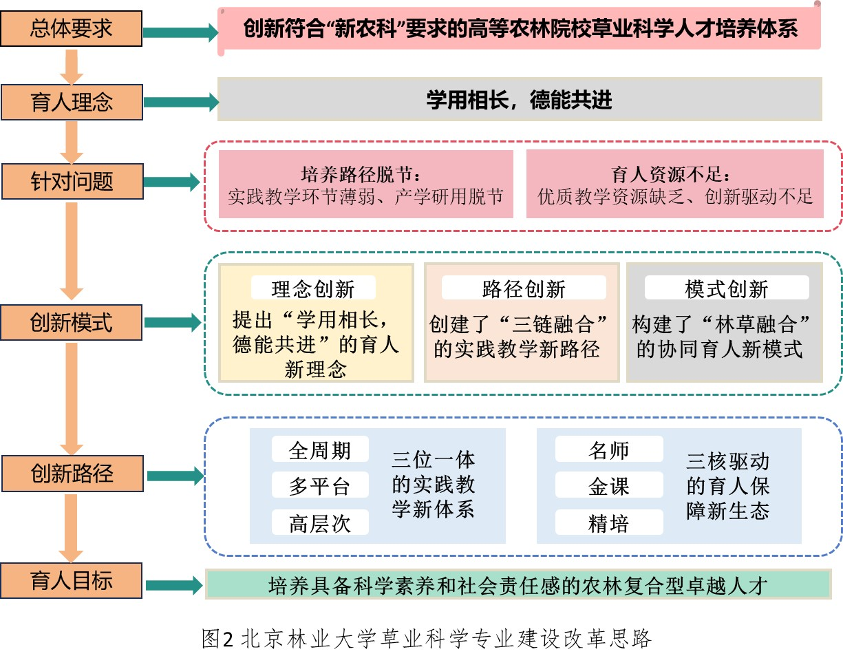 在“新农科”建设背景下,项目团队重构了“学用相长,德能共进”的教育体系,紧密结合草业科学专业的特点,增强草业科学专业服务现代农业发展、山水林田湖草沙一体化保护和系统治理的适应性和针对性,旨在培养具备科学素养和社会责任感的农林复合型卓越人才(见图2)。