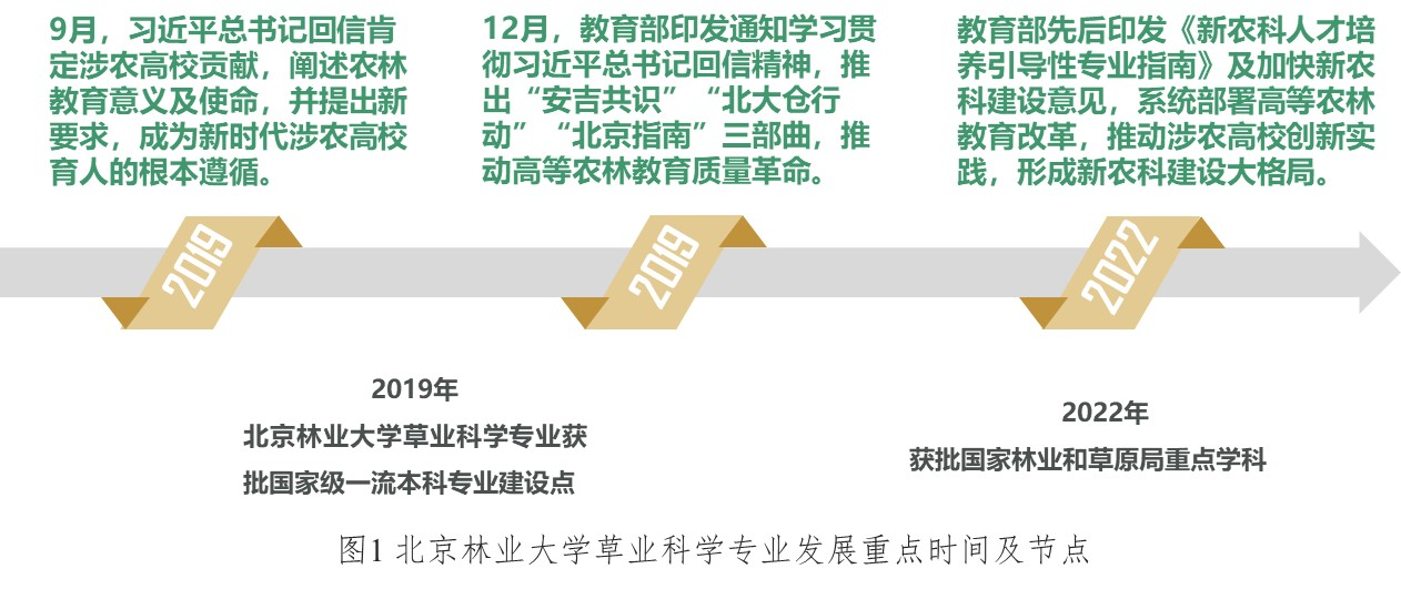 2019年9月5日,习近平总书记给全国涉农高校的书记校长和专家代表回信,充分肯定了新中国成立70年来涉农高校为“三农”事业发展做出的积极贡献,深刻阐述了高等农林教育的重要意义和涉农高校的历史使命,并对广大涉农高校办学方向提出新要求,成为新时代涉农高校为党育人、为国育才、服务强国建设的根本遵循。其后,教育部相继印发《关于学习贯彻习近平总书记给全国涉农高校书记校长和专家代表重要回信精神的通知》和《新农科人才培养引导性专业指南》等文件,对深化高等农林教育改革做出系统部署,涉农高校持续创新实践,形成了统筹推进新农科建设发展大格局(图1)。