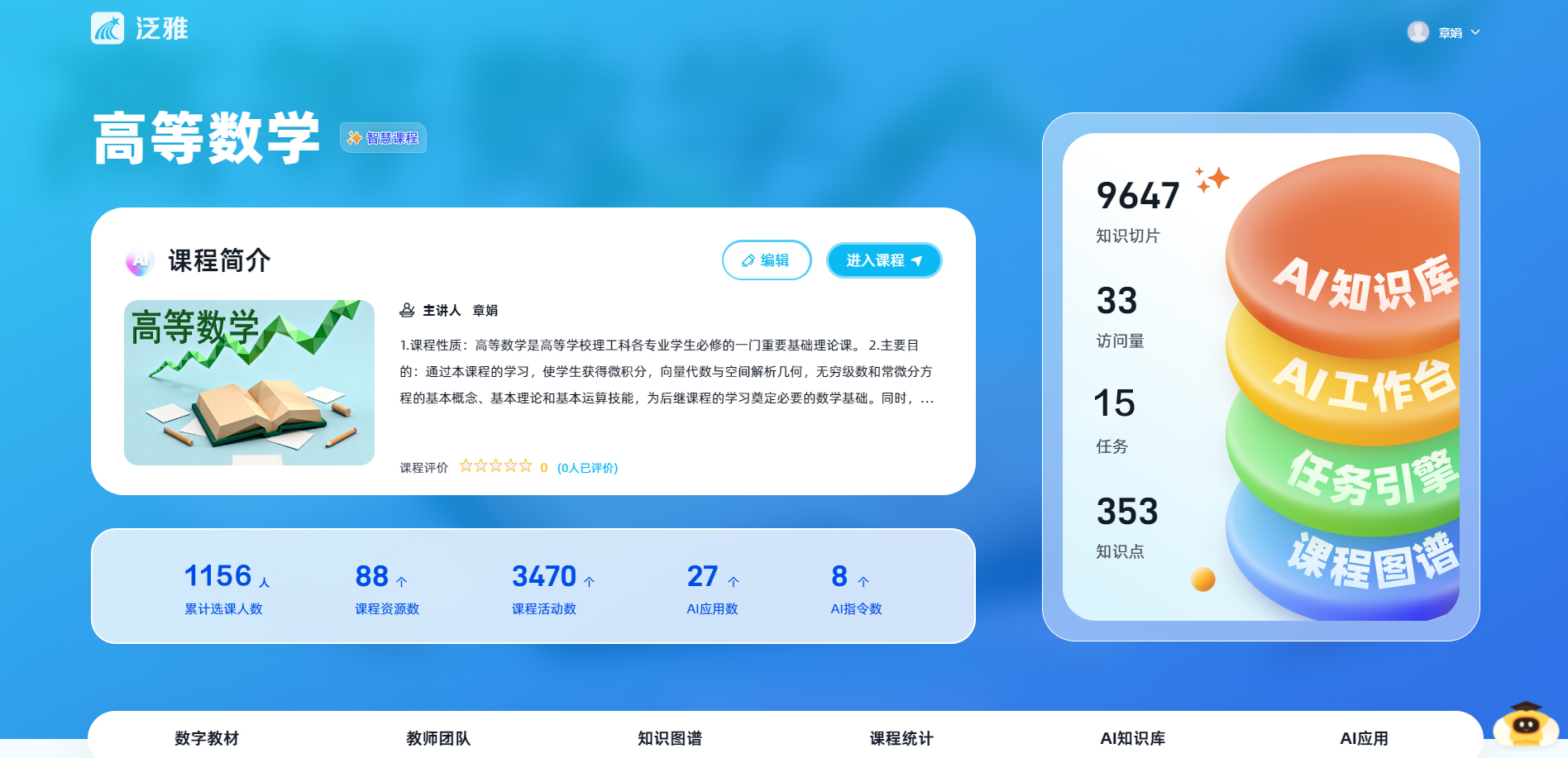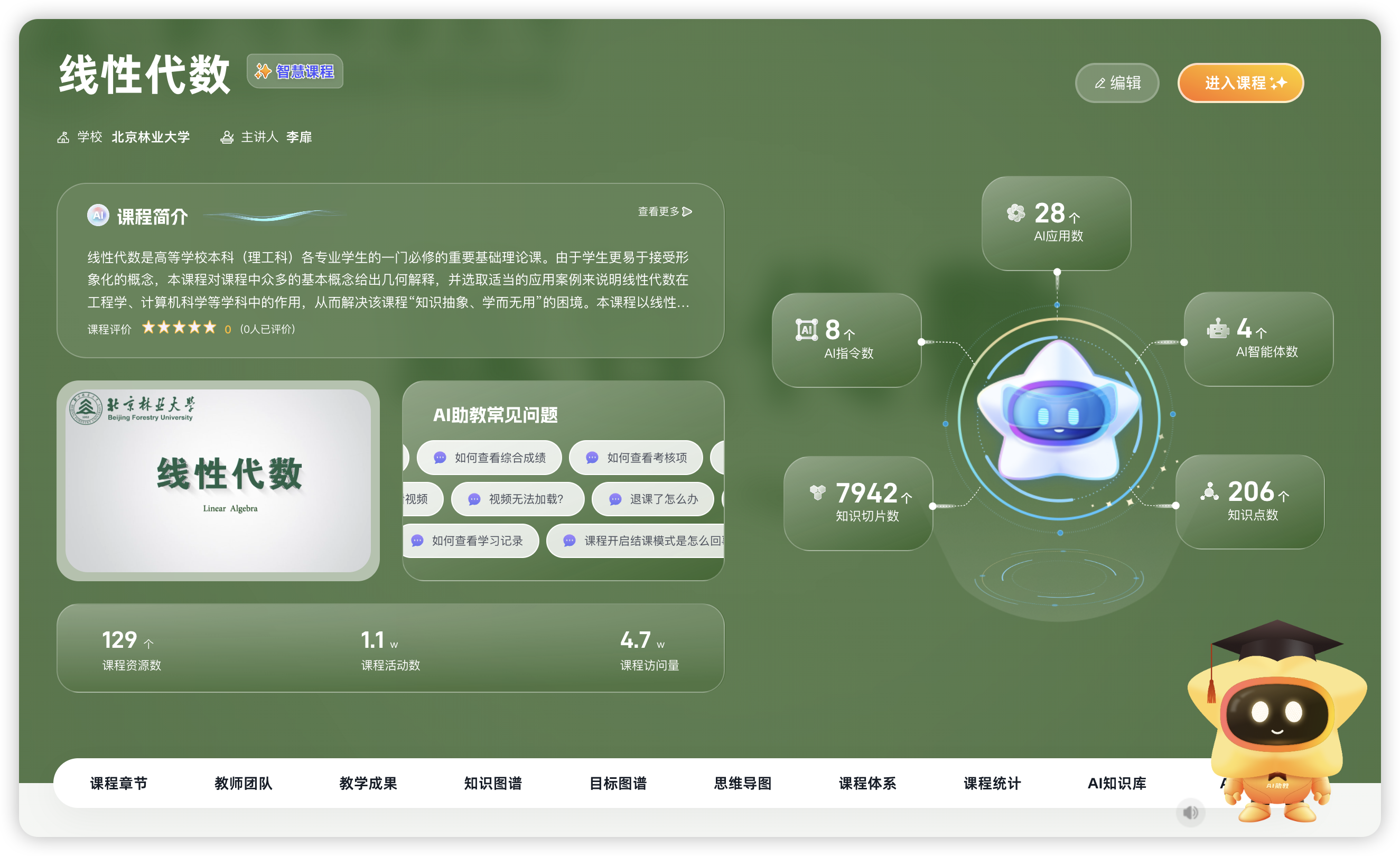 课程建设与课堂质量成效显著。精心打造出《高等数学(基础)》《高等数学(拓展)》《线性代数(基础)》《概率论与数理统计》等5门精品慕课。出版配适农林院校特色的教材7部。《高等数学》与《线性代数》已完成智慧课程建设(图9),课程集成知识图谱、视频资源、智能题库、数字教材与AI助手等功能,构建“教、学、练、评、辅”为一体的智慧教学环境。平台运行稳定,覆盖多个专业与层级,教学实施顺畅,师生反馈良好。《高等数学》与《线性代数》分获第二届、第三届北京高校教师教学创新大赛二等奖;《高等数学》获评北京市优质课程、优质教案,并入选北京市高等教育学会教改示范案例;《高等数学》等三门课程5次获评“好评课堂”(获奖率仅0.2%),多项成绩表明,大学数学基础系列课程在教学质量、资源建设和模式创新方面成效显著,形成良好的示范效应。