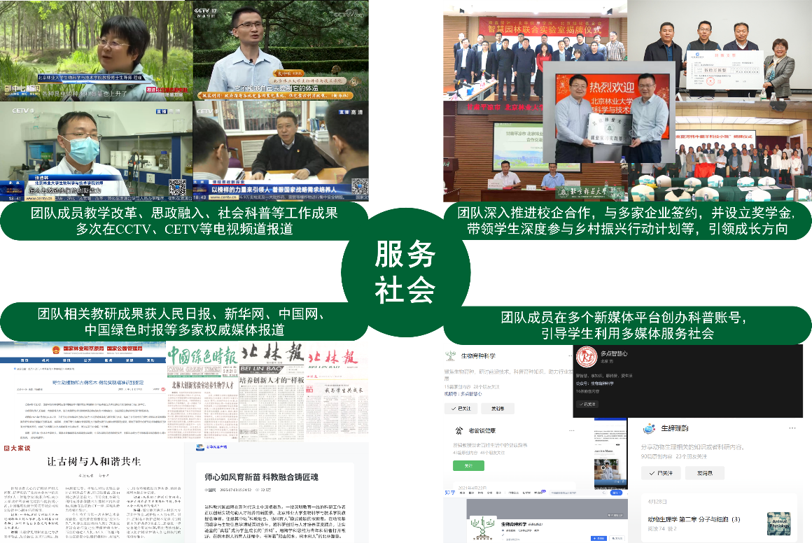 团队教学改革成果丰硕,获北京林业大学教学成果奖特等奖、一等奖、二等奖多项;团队多项教研成果,教师开展的科普行动、专题辅导等获CCTV等20余家媒体报道,发出“北林声音”,产生了广泛社会影响力;联合华为、中国科学院软件研究所等单位搭建智能软件研究中心、智慧林草联合创新中心等产学研人才培养平台,推动产学研深度融合;深度挖掘课程中生态文明建设、“双碳”战略等思政元素,扎根中国大地办教育,为党育人,为国育材,坚持将思政之“盐”溶入课程之“汤”教学理念,建设课程思政案例集库,将其融入专业课程教育教学,获央视教育频道专题报道;与北京顺鑫绿洲锦绣园林工程有限公司、北京绿化基金会联合搭建智慧园林联合实验室,实现高校、企业和绿化慈善组织三方共同发展、优势互补,服务绿色发展和生态文明建设;建设了本科生深度参与的“甘肃夏河牦牛藏羊科技小院”,获首都高校师生服务乡村振兴行动计划优秀奖;创办了“生物育种科学”公众号等新媒体平台,引导学生用多媒体服务社会,指导开发的古树保护、全民义务植树等智慧系统广泛落地应用。以上成果不仅充分体现团队育人实效,更依托育人成果深化社会服务,扩大社会影响力,实现育人与社会服务的同频共振(图3)。