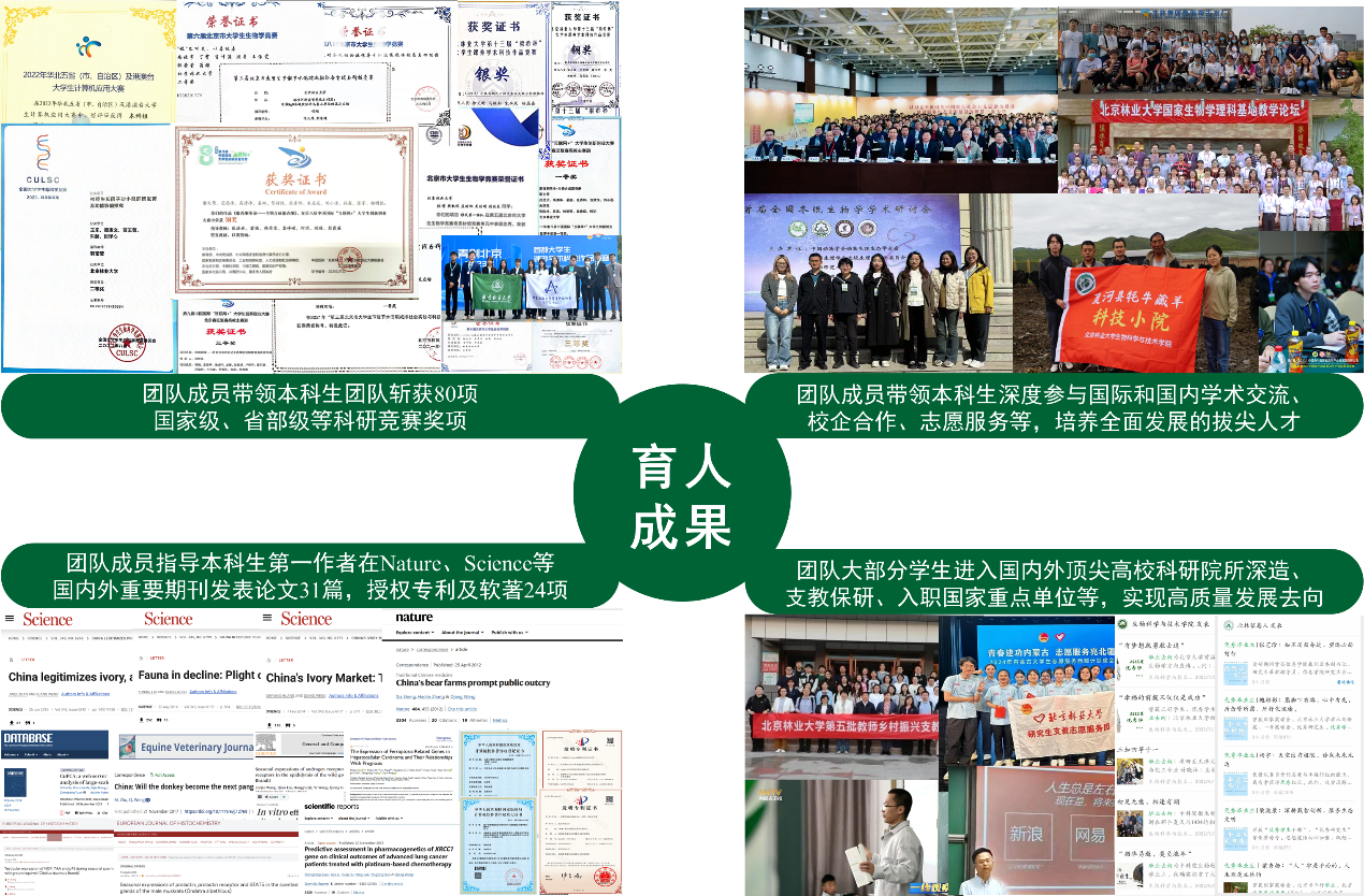 团队指导本科生第一作者在Nature、Science等国内外重要期刊发表论文31篇,科研训练成果获全国大学生生命科学竞赛等国家级省部级奖80项,授权24项国家发明专利及软件著作权,学生独立科研能力与实践创新能力得到极大提升,学生在升学与就业中具备更强核心竞争力,培养的学生获高质量发展去向,保研或申请至进入耶鲁大学、中国科学院、北京大学、清华大学等国内外顶尖高校科研院所深造,或入职国家林业和草原局等生态文明建设相关重点单位;10名学生前往基层开展支教工作,覆盖内蒙古自治区科右前旗等地共6所乡村中小学,受助学生超700名。学生的科研素养及实践能力获得了用人单位的高度认可,充分印证了团队构建的人才培养模式改革的实践有效性,彰显了本成果适配国家战略需求的育人价值(图5)。