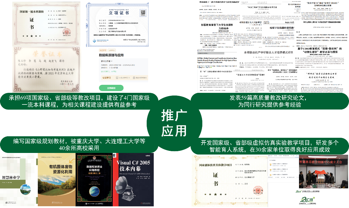 团队依托“科教融汇、数智赋能、成长领航”创新路径,产出一系列可复制、可推广的成果。打造了《动物生理学A》等一系列国家级一流课程,承担了北京市首批人工智能通识课“智慧林业”,为相关课程建设提供了有益参考;发表了59篇教改研究论文,为同行研究提供参考经验;编写《数据库原理及应用教程》等国家级规划教材,被重庆大学、大连理工大学等40余所高校采用;研发智能学生画像系统、OJ在线测评系统等信息化教学系统,利用数智技术辅助个性化学情追踪和心理指导,在中国科学院大学、北京航空航天大学等30余家单位取得良好应用成效,实现了改革成果的跨单位、多渠道辐射推广(图2)。