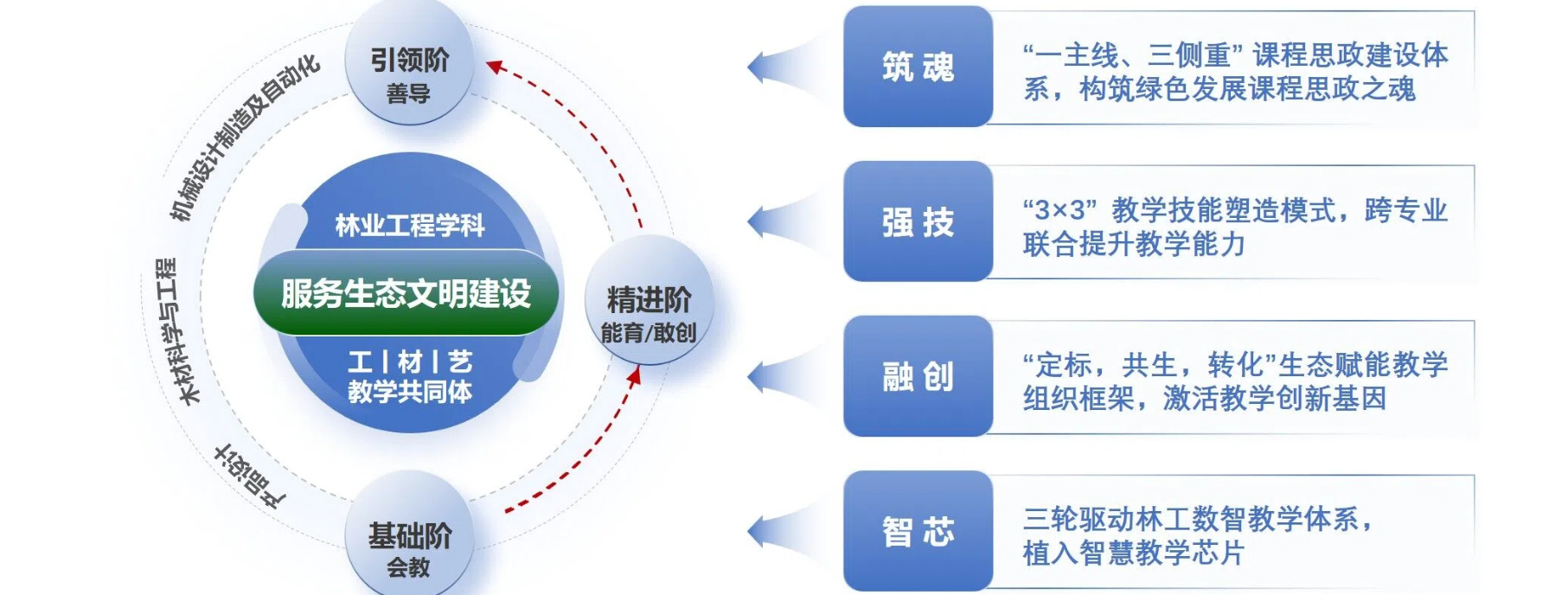 • 【国家战略】习近平总书记强调“生态文明建设是关系中华民族永续发展的根本大计”,教育部《高等学校课程思政建设指导纲要》等政策明确要求:打造生态文明教育特色课程、培养专业化教师队伍,推动绿色理念融入教育源头。 【学校需求】学校发布《中国生态文明发展报告2023》,为生态文明建设提供智库支持,需建设拥有先进生态文明教育理念、强劲教学能力的教学队伍。林业工程学科肩负着生态文明建设人才培养重任,又是机械、木材、产品设计类专业特色发展的重要依托,亟需组建以该学科为核心的跨专业、跨学院育人团队。 【团队背景】团队核心成员因北京市青教赛获奖而授予首批北京示范教研工作室。在林业工程学科背景下,依托该工作室由工学、材料、艺设学院骨干教师组成了跨专业教学共同体,共同开展教学学术研究,旨在打造一支服务生态文明建设的林工育人团队,着重锻炼“生态引领教学育人、跨界提升教学技能、绿色赋能教学创新、数智助力教学效能”四方面能力。 【改革思路】提出“四维三阶”育人团队建设理念,构建“筑魂·强技·融创·智芯”四维行动框架,为教师提供“基础→精进→引领”三阶发展途径: ①“筑魂”:将“绿色发展思想”纳入教学目标,构...