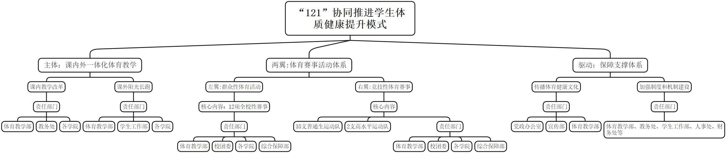 学校党委常委会每年专题研究 1 次体育工作,将其纳入发展规划,分管领导牵头召开部门协调会,同步进展、解决难题;完善投入机制,持续拨付教学、行政、高水平运动队建设经费,加大重大体育文化活动专项资金支持,明确课堂教学、赛事组织、场地维护等多部门职责,形成 “统一规划、分工协作、齐抓共管” 体系;落实安全责任,强化体育场馆、器材及大型活动安全管理,每年规划场馆建设与修缮。