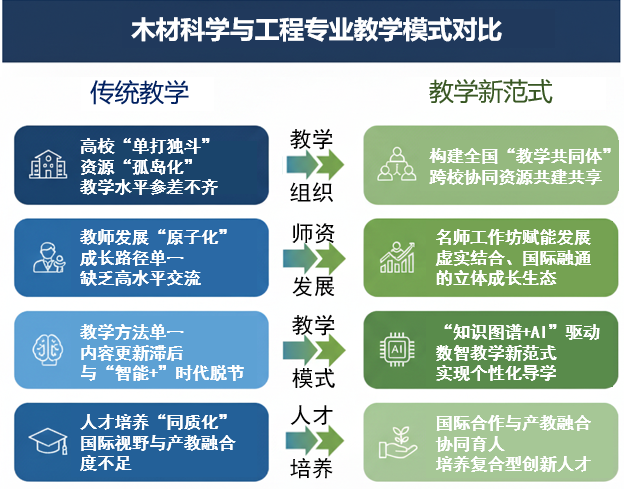 在此背景下,作为一种突破时空限制、汇聚优质资源、促进协同创新的新型基层教学组织,“虚拟教研室”应运而生。2022年,由北京林业大学牵头,联合全国十余所兄弟院校及行业龙头企业共同建设的“木材科学与工程专业虚拟教研室”,成功入选教育部首批虚拟教研室建设试点。这不仅为本专业的教学改革提供了一个前所未有的国家级平台,也标志着一项旨在构建全国性“教学共同体”,以“跨校协同、数字赋能、国际融通”为路径,系统性破解传统工科教学难题,重塑本科教学新生态的探索与实践,正式拉开序幕。本成果正是基于这一国家级试点平台,历时三载深入实践而形成的系统性教学改革方案与成果总结。
