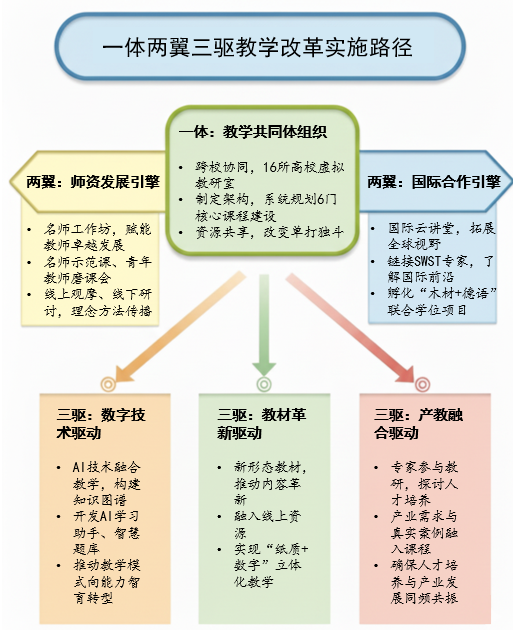 为将上述理念转化为可操作、可落地的具体行动,我们独创性地设计了 “一体两翼三驱” 的教学改革实施路径。“一体”指以构建跨校协同的“教学共同体”组织为本体,是改革的组织保障。“两翼”指以打造“师资卓越发展”与“国际合作融通”为两大引擎,是推动改革的关键动力。“三驱”则指以强化“数字技术赋能”、“新形态教材革新”与“产教深度融合”为三大核心驱动力,是改革落地的重要抓手。通过这一系统性的改革思路与实施路径,我们旨在从教学组织模式、师资发展机制、教学范式、育人路径等多个维度对本专业的本科教学进行一次彻底的重塑与升级。