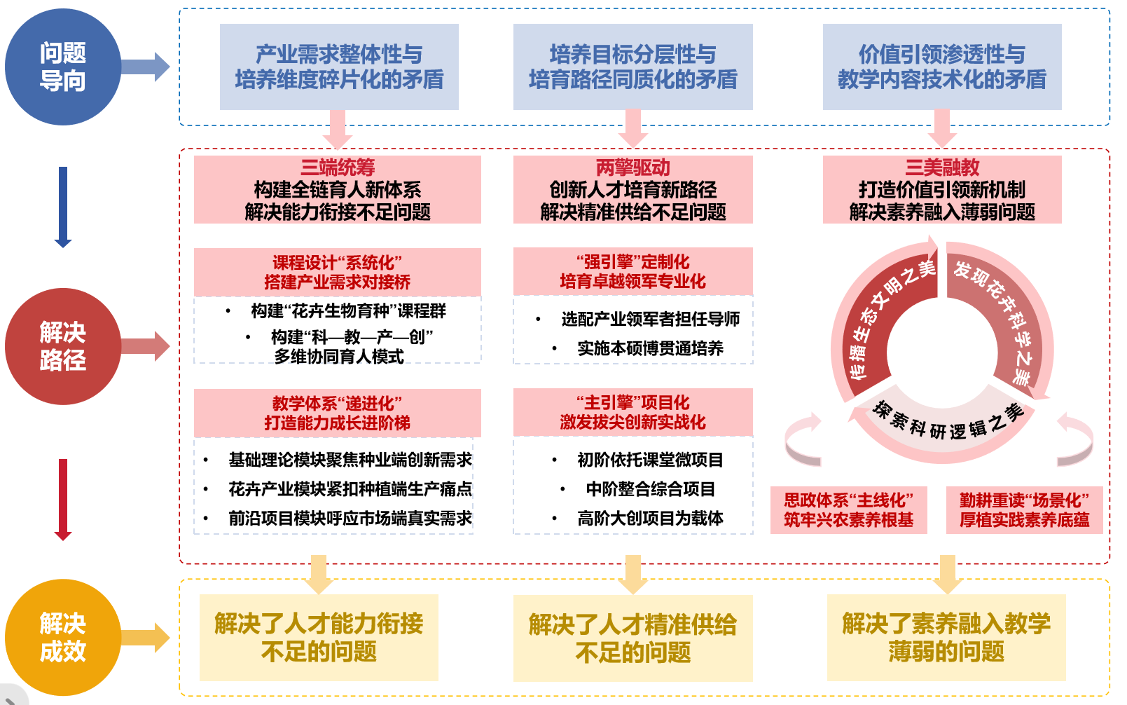针对花卉产业对拔尖创新与卓越领军人才的差异化需求,构建“主引擎聚焦拔尖创新人才+强引擎瞄准复合应用人才”双擎分层培养体系,辅以数智化(AI教学平台)、案例化(本土案例)、情景化(虚仿实验)、关联化(知识图谱)的立体化教学资源,强化科研训练与产业问题解决能力,精准提升技术集成与产业引领能力,解决传统“一刀切”模式无法适配高端人才成长需求的问题。