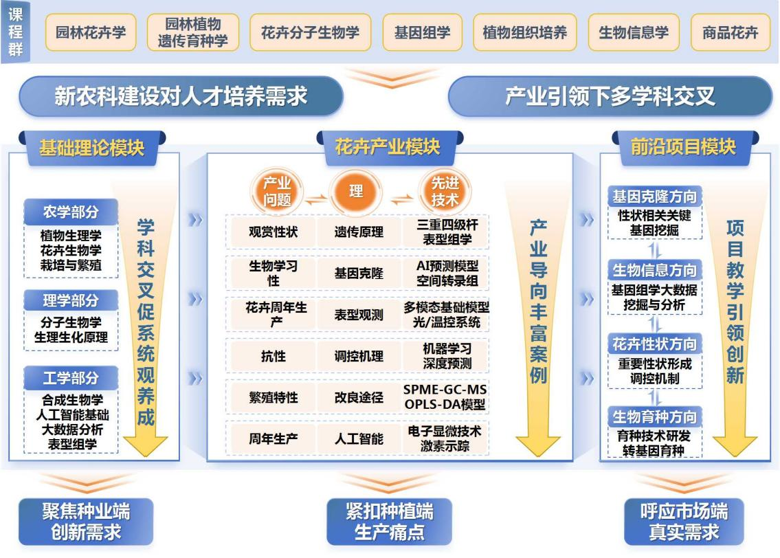 打破传统纯理学、纯农学教学组织模式,构建“基础理论-花卉产业-前沿项目”递进式教学体系,解决学生能力逐层提升衔接不畅问题:基础理论模块聚焦种业端创新需求,注重农理、农工交叉,融入生物大数据、AI分子预测等前沿内容,为学生奠定解决种质创新关键问题的跨学科知识基础;花卉产业模块紧扣种植端生产痛点,以花色改良、抗逆育种等为教学主线,系统解析“种业研发—种植适配”的协同逻辑,培养学生对接种植环节技术需求的实践能力;前沿项目模块呼应市场端真实需求,将分散实验整合为“做项目、出成果”的实战任务,通过“解决真问题”推动知识向能力转化,实现从种业创新到种植落地再到市场应用的全链条能力衔接,促进知识应用落地。