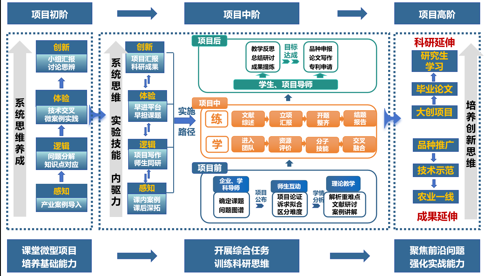 针对传统育人中课程与产业三端需求脱节、教学与全链能力培养割裂的问题,以“课程设计系统化”和“教学体系递进化”为核心抓手,通过整合课程群对接产业需求、搭建递进式体系贯通能力成长,同步构建“科—教—产—创”协同模式,实现人才培养与种业端、种植端、市场端全链条需求的深度衔接,为学生全产业链综合能力养成搭建桥梁。