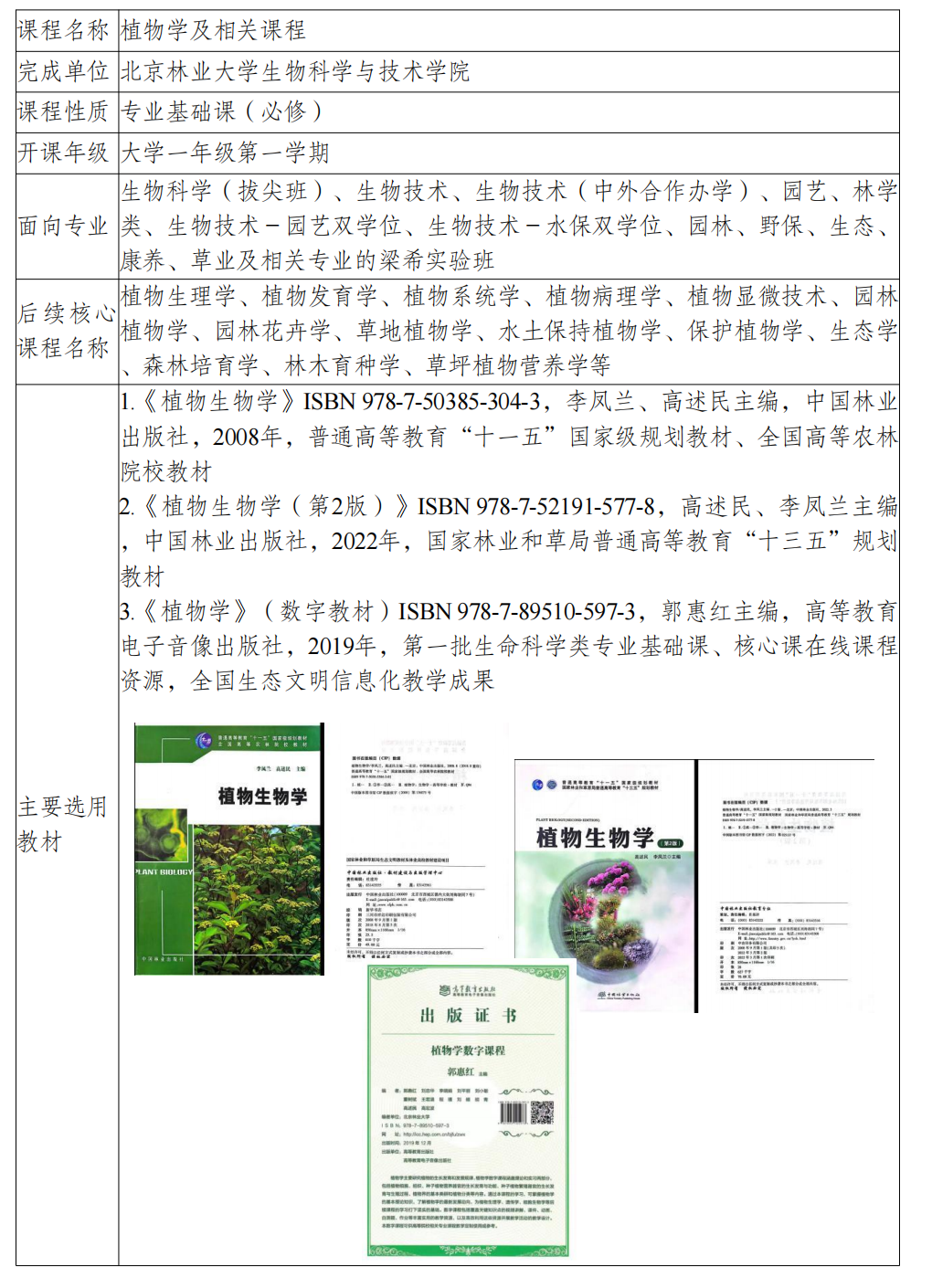 强大的学科实力支撑和推动着植物学相关课程的发展。著名的植物学老前辈汪振儒教授是我校植物学课程的创始和奠基人。经过几代人的努力,植物学教学水平在全国高等林业院校植物学课程教学中达到了领先水平。1980 年,曹慧娟先生主编的《植物学》正式成为全国高等林业院校植物学的统编教材,不仅全国高等林业大学和部分农业大学本科教学使用,部分综合性大学的非生物专业也使用该教材;2007 年,获批北京市精品课程;2008 年,李凤兰教授主编的《植物生物学》教材入选国家级规划教材,2009 年起,植物学课程团队秉承前辈敬业严谨、乐教至真的教风,积极推动课程思政和数字化改革,11 门次课程先后入选北京林业大学好评课程,居全校榜首;2019 年,出版的植物学数字课程被教育部高等学校生物类教指委推荐为第一批生命科学类专业基础课、核心课在线课程资源;2022 年,修订再版《植物生物学》教材,2025 年,程瑾教授作为课程负责人承担的植物学B入选第三批国家一流本科课程(已完成公示),教学团队也成长为植物生物学北京市优秀教学团队国家级教学团队的骨干力量。