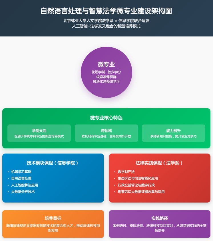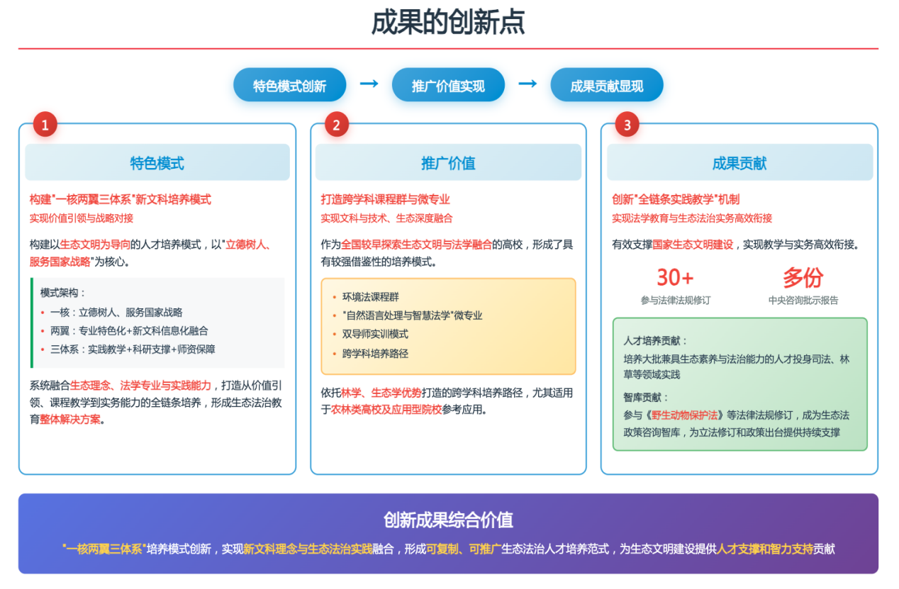 作为全国较早探索生态文明与法学融合的高校,形成的环境法课程群、“自然语言处理与智慧法学”微专业、双导师实训等模式具有较强借鉴性。依托林学、生态学优势打造的跨学科培养路径,尤其适用于农林类高校及应用型院校参考应用。
