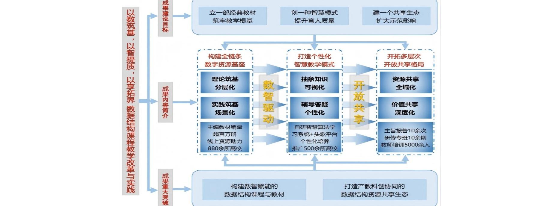 • 数据结构是计算机类专业的核心课程,本成果立足新工科与人工智能时代创新人才培养要求,以“数智驱动、开放共享”为核心理念,构建“以数筑基,以智提质,以享拓界”的递进式数据结构课程建设新模式,打造“一部教材引领、两大平台支撑、产教科创协同、全域资源共享”的育人新体系,重点培养学生的计算思维、实践能力与创新能力。