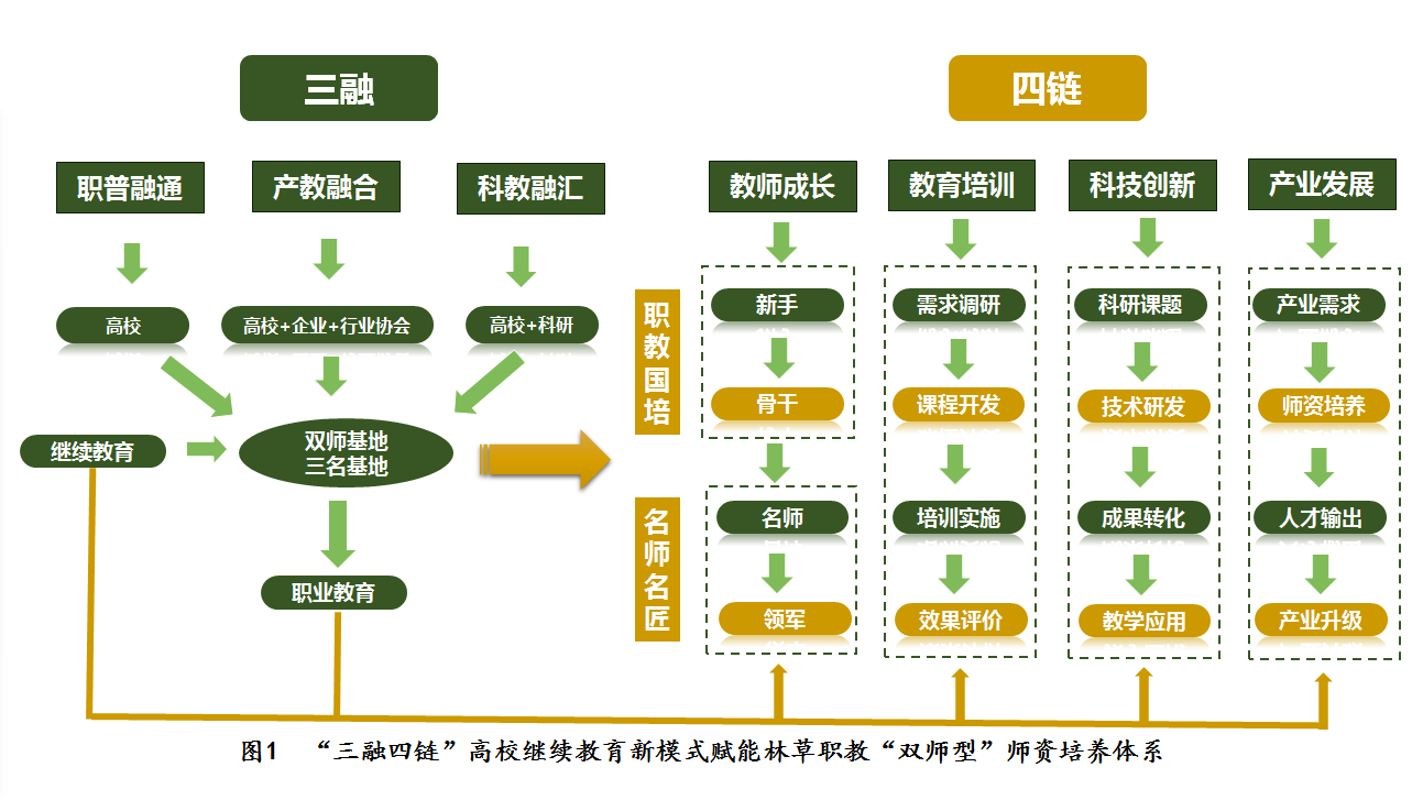 教师是立教之本、兴教之源。《国家职业教育改革实施方案》明确提出“建设一支高素质双师型教师队伍”,《“十四五”林业和草原保护发展规划纲要》进一步强调“加强林草职业教育师资队伍建设,提升行业人才培养质量”。林草行业作为生态文明建设的核心领域,其职业教育承担着培养技术技能人才、服务产业升级的重要使命,而“双师型”师资则是连接教育与产业、理论与实践的关键纽带。当前,林草职教“双师型”师资培养仍存在三大核心痛点:一是林职师资培养脱轨、脱节。林职师资培训内容孤立滞后、引育机制乏力,高教融合度低,培养效果不佳。二是“三教协同”适配队伍不足。各地林草发展不均衡,高等教育、继续教育、职业教育三者融合发力不足,新质人才培养匮乏。三是继续教育服务行业师资少。林业高校继续教育聚焦林职师资队伍建设欠缺,且未形成培养体系和机制。在此背景下,北京林业大学以继续教育为枢纽,创新构建“三融四链”培养模式,系统性破解行业难题,为林草职教师资队伍建设探索新路径。