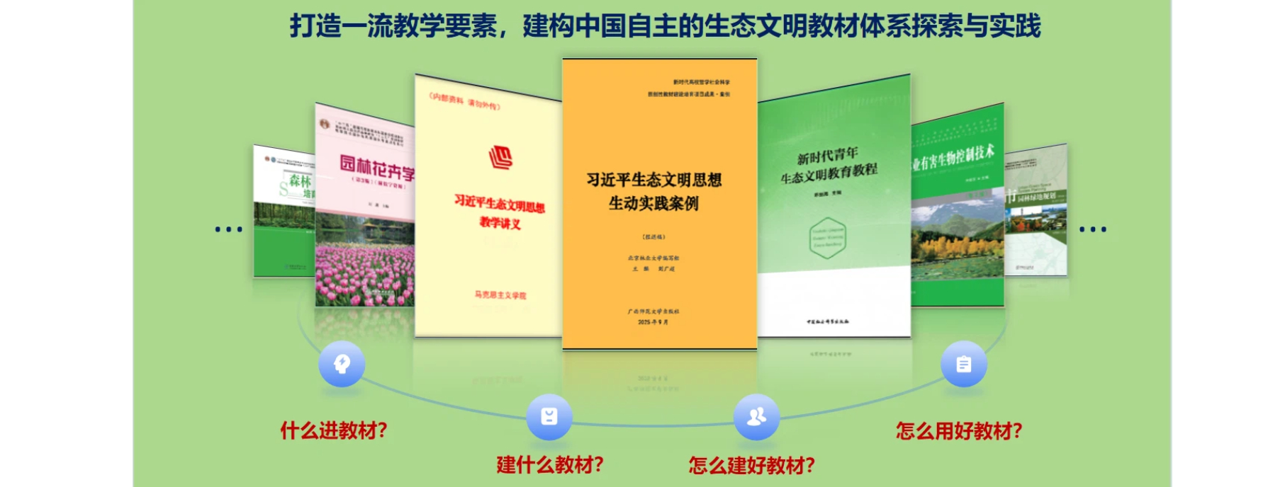 • 教材是落实立德树人根本任务的关键要素,是建成教育强国的坚实基础和战略支撑。《教育强国建设规划纲要(2024-2035年)》明确要求“深入总结新时代伟大实践,推出‘中国系列’原创教材,打造自主教材体系”。习近平生态文明思想是习近平新时代中国特色社会主义思想的重要组成部分, 生态文明建设是“五位一体”总体布局中的重要“一位”,用习近平生态文明思想指导生态文明建设实践,亟须培养造就一批领军人才,关键在于建设一套高质量的生态文明教材体系,构建自主生态文明教材体系至关重要。生态文明是一个交叉领域,不仅包括传统的生态学和环境科学,而且涉及生态经济学、生态安全学、生态伦理学等交叉学科。本成果联合4所林业高校、高等教育出版社、中国林业出版社通过10年的实践探索,聚焦“两个不健全、两个不突出”的中国生态文明自主教材体系建设问题,着力诠释中国生态文明自主教材体系是什么、如何发挥中国生态文明自主教材体系的作用等时代课题,形成“中国生态文明自主教材体系”探索实践。北京林业大学联合中国林业出版社于2018年出版了中国第一部大学生生态文明教材。团队诠释了以习近平生态文明思想为核心的中国生态文明自主教材体系的内在规律的认识和把握,加强各级各类教材的纵向贯通和横向衔接,深化生态文明自主教材体系与自主学科体系、学术体系、教学体系的关系等相关研究。
