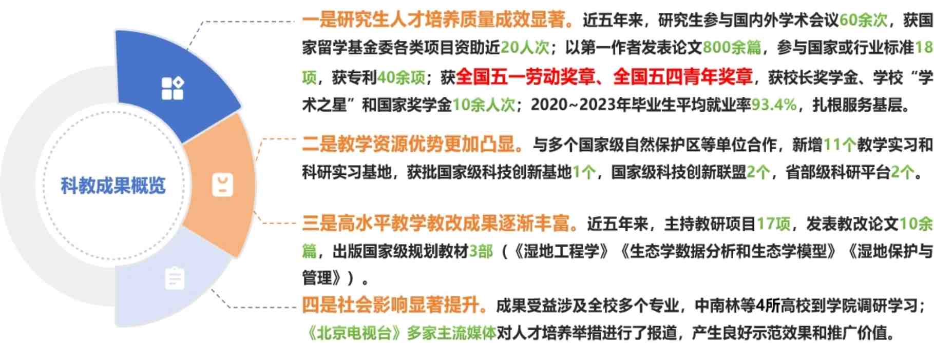 以“课程重构-师资引育-平台共建”为三大支柱,系统创建贯通理论教学、实习实训与科研实战的全链条育人体系。创建“基础类理论-专业类技能-科学类研究”三段式课程模块,将校外基地实践、企业产业化课题、国际前沿课程融入教学全过程,实现从知识输入到能力输出的无缝衔接。同时,打造“人才引领+柔性引智+本土培育+党建赋能”四位一体的梯次师资团队,建设“百地百团”科教融合育人工程,推动学生在真实场景中锤炼科研素养与系统思维,形成“学在湿地、研在一线、用在全球”的育人新生态。