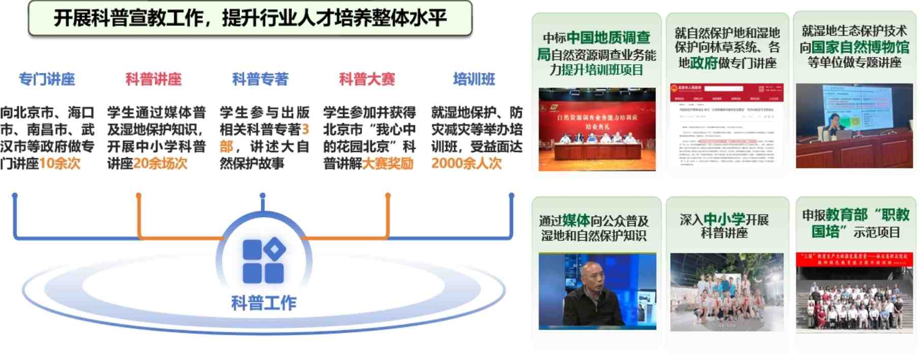 开展科普工作,提升行业整体水平。研究生参与面向政府、中小学及公众的科普讲座20余场,出版科普专著3部,获北京市科普讲解大赛奖,就湿地保护、防灾减灾等问题举办行业培训超2000余人次。