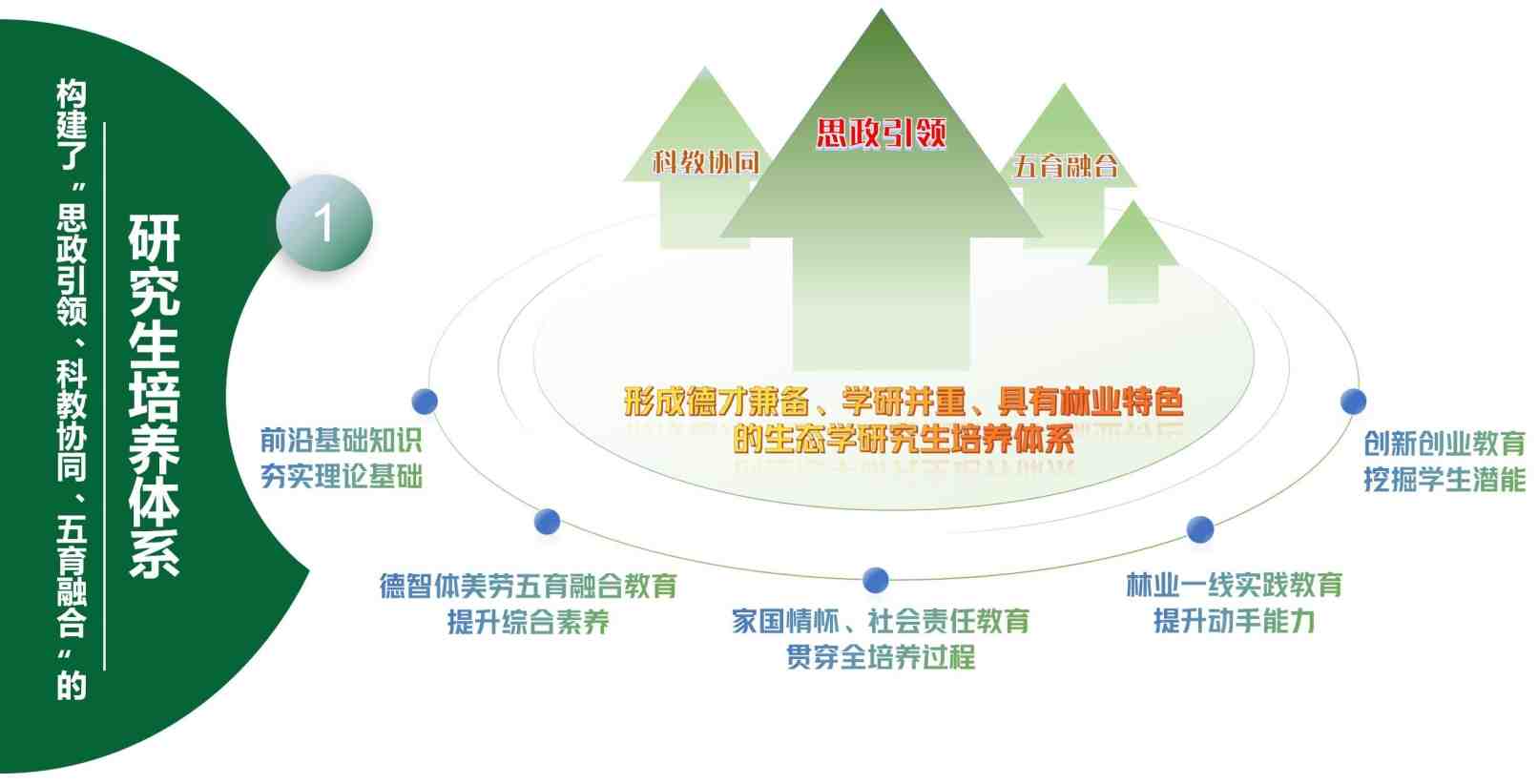 1构建了“思政引领、科教协同、五育融合”的研究生培养体系。将家国情怀、社会责任教育贯穿培养全过程,前沿知识教育夯实理论基础,五育融合教育提升综合素养,创新创业教育挖掘学生潜能,林业一线实践教学提升动手能力,形成德才兼备、学研并重、具有林业特色的生态学研究生培养体系。