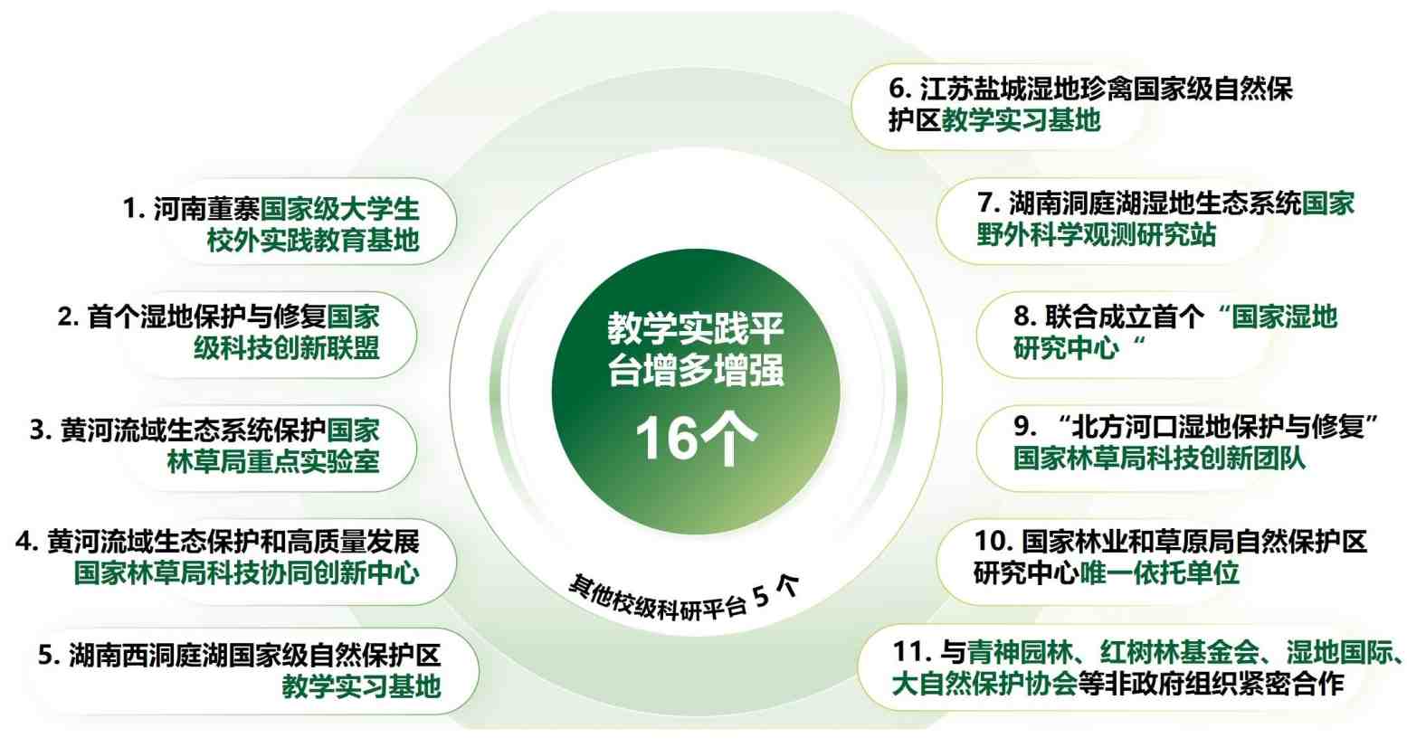 建成一批高水平教学实践平台16个,包括国家级大学生校外实践教育基地、首个湿地保护修复国家级科技创新联盟、首个国家湿地研究中心、首个国家林草局湿地科技创新团队、多个国家级野外台站和省部级重点实验室;在十余个国家级自然保护区建立教学实习基地;作为唯一依托单位承建国家自然保护区研究中心,与湿地国际、TNC等国际组织合作,构建起多元协同的育人资源网络。