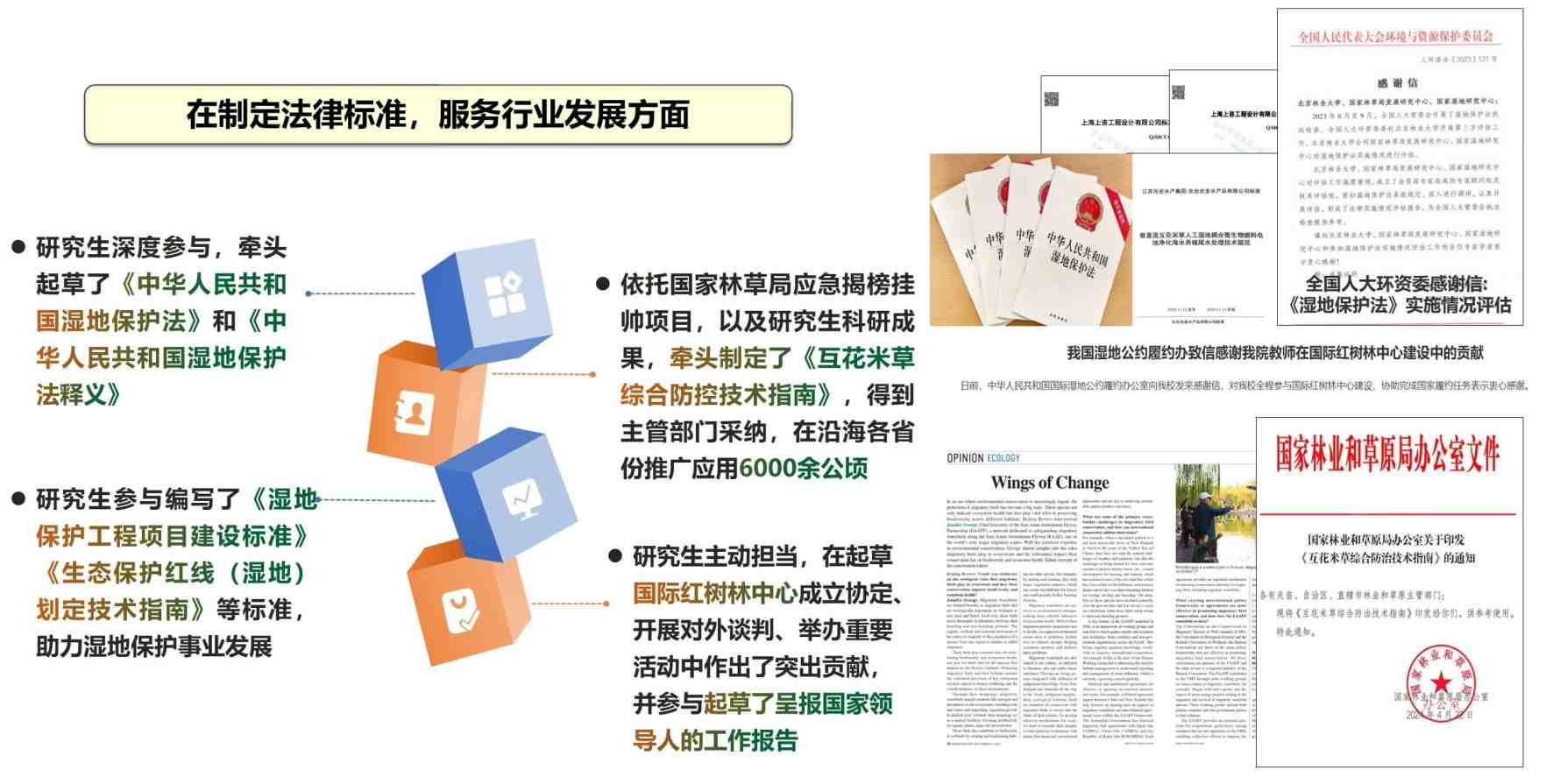 制定法律标准,服务行业发展。研究生深度参与起草《中华人民共和国湿地保护法》,参与编写《湿地保护工程项目建设标准》等标准规范,制定的《互花米草综合防控技术指南》得到主管部门采纳;研究生主动担当,在起草国际红树林中心协定、开展对外谈判中作出突出贡献,参与起草了呈报国家领导人的工作报告。