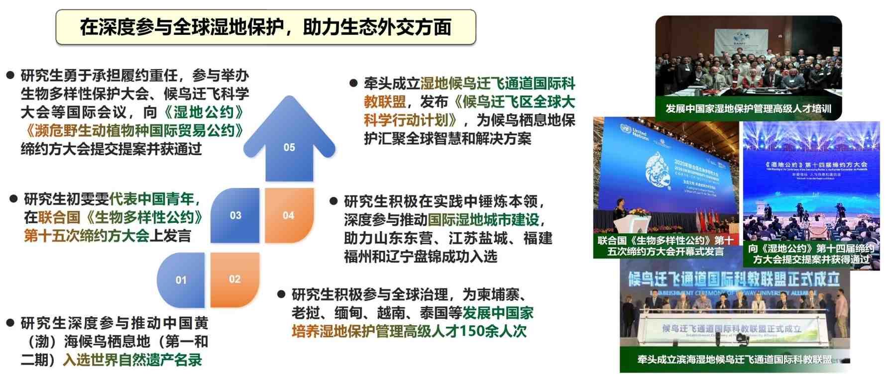 深度参与全球治理,助力生态外交。研究生承担履约重任,向《湿地公约》《濒危野生动植物国际贸易公约》缔约方大会提案并获通过;在联合国大会介绍研究工作,入选全球“生物多样性100+”推荐案例,推动中国黄(渤)海候鸟栖息地入选世界自然遗产名录;深度参与推动国际湿地城市建设,助力东营、西藏等地成功入选,为柬埔寨、老挝等发展中国家培养湿地保护管理高级人才150余人次。