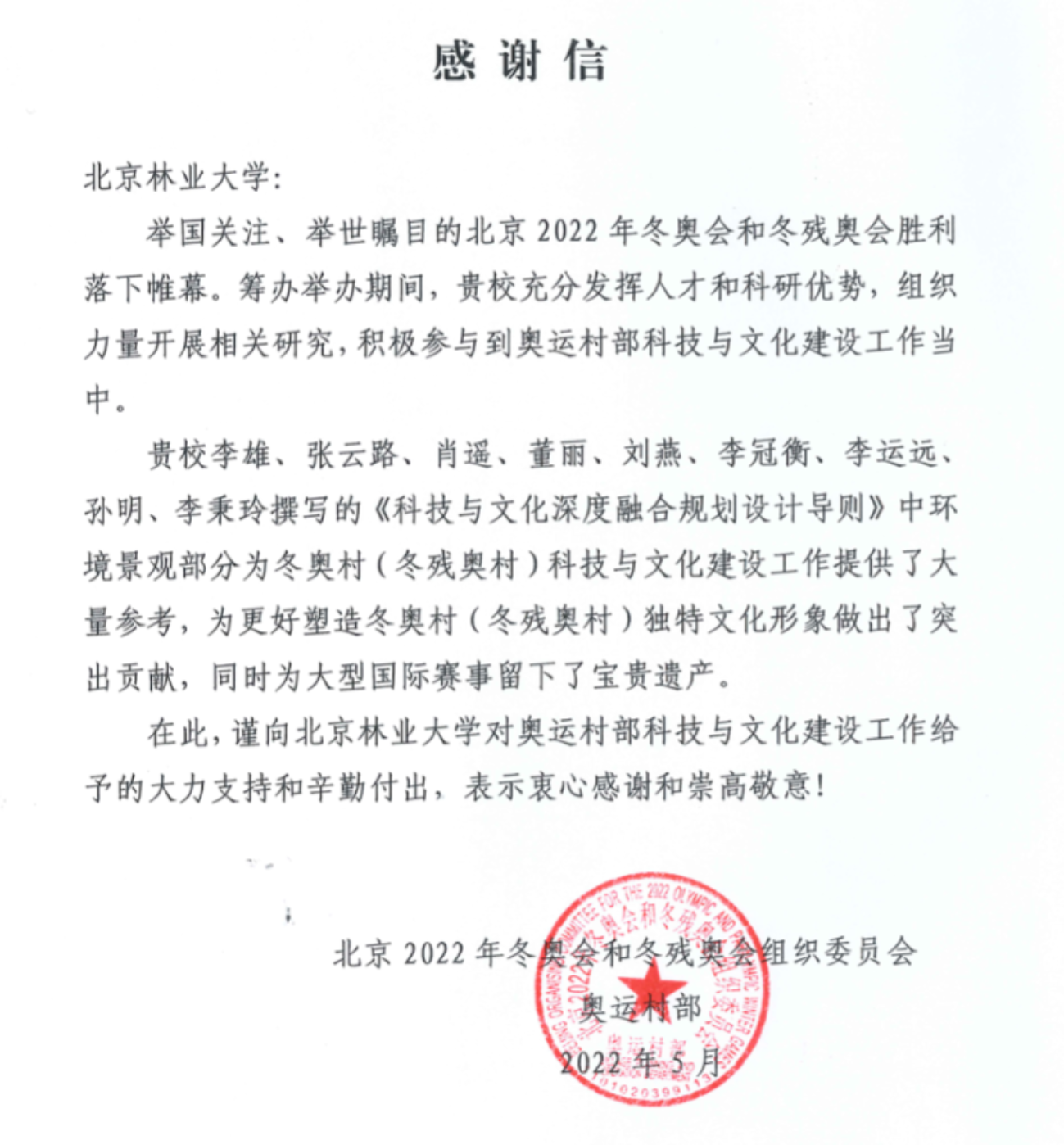 北京冬奥组委向北林园林学院师生团队发来感谢信