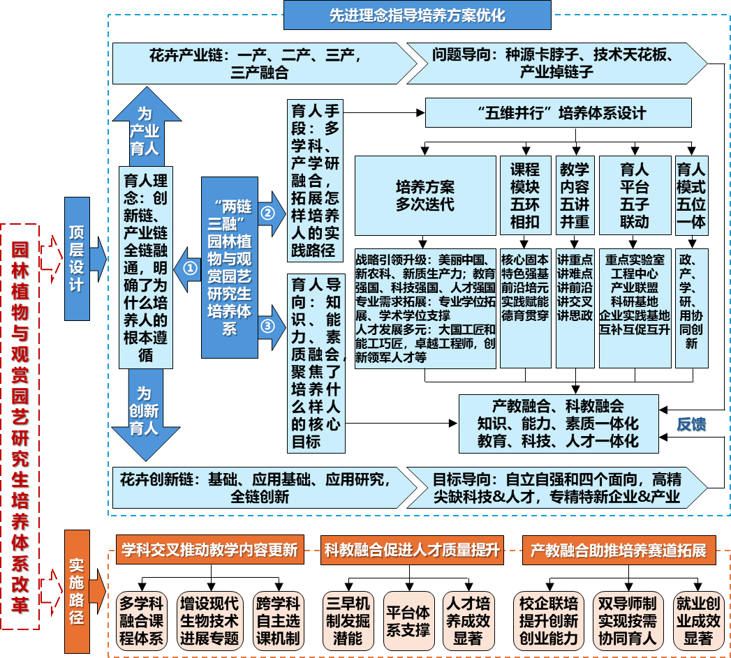 培养体系强化培养方案、课程体系、教学内容、研究平台、育人模式五维并行内涵建设,建立核心固本、特色强基、前沿培元、实践赋能、德育贯穿的五环相扣课程模块,凝练重点、难点、前沿、交叉、思政五讲并重教学内容,搭建重点实验室、工程中心、产业联盟、研究基地、企业五子联育人平台,构建政、产、学、研、用五位一体协同创新育人模式累计培养研究生1200余人,多数成为教学、科研及管理领域中坚力量和具有国际话语权的专家;研究成果促进我国花卉产业升级,荣获国家科技进步二等奖3项等标志性成果形成北林花卉品牌和人才培养特色教改成果被全国同行借鉴应用。