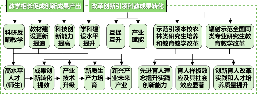 坚持立德树人产学研协同育人思想,构筑两链三融研究生育人理论框架,创建创新链、产业链融通,多学科、产学研融合,知识、能力、素质融会的拔尖创新研究生培养体系。培育出一批突破性强、显示度高的教学、科研成果,培养了一批厚植家国情怀、专业扎实的高层次人才,引领了全国园林植物与观赏园艺研究生培养和教育教学改革方向。