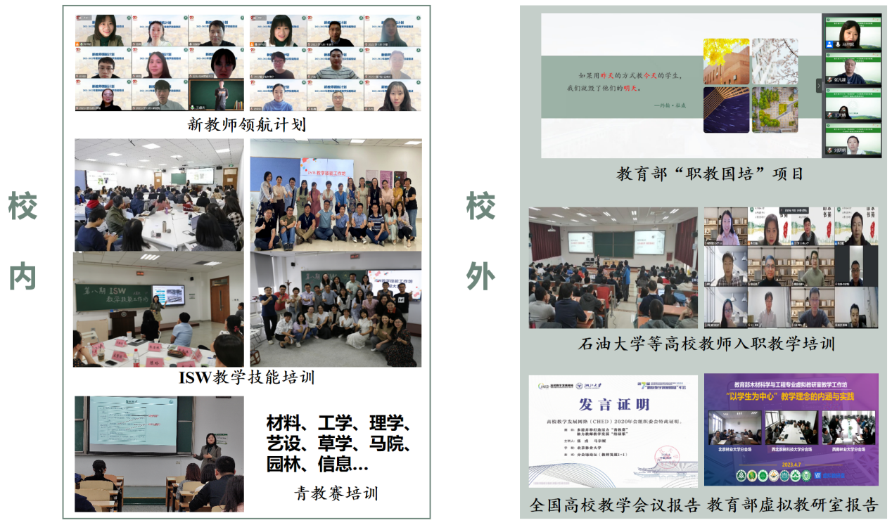 推广应用:课程教学创新成果依托教育部虚拟教研室等平台进行交流,在东北林业大学、南京林业大学、浙江农林大学、西南林业大学、广西大学等多所林业院校进行推广应用,对研究生专业课程建设发挥了高度示范作用。同时,积极投身于我校“新教师领航计划”、ISW教学技能工作坊、青年教师基本功比赛赛前辅导等工作,并受邀为教育部“职教国培”项目、北京师范大学、中国石油大学(北京)、陆军炮兵防空兵学院、陆军步兵学院等院校教师开展教学创新培训,发挥辐射作用,累积参与教师超过千人(图5)。