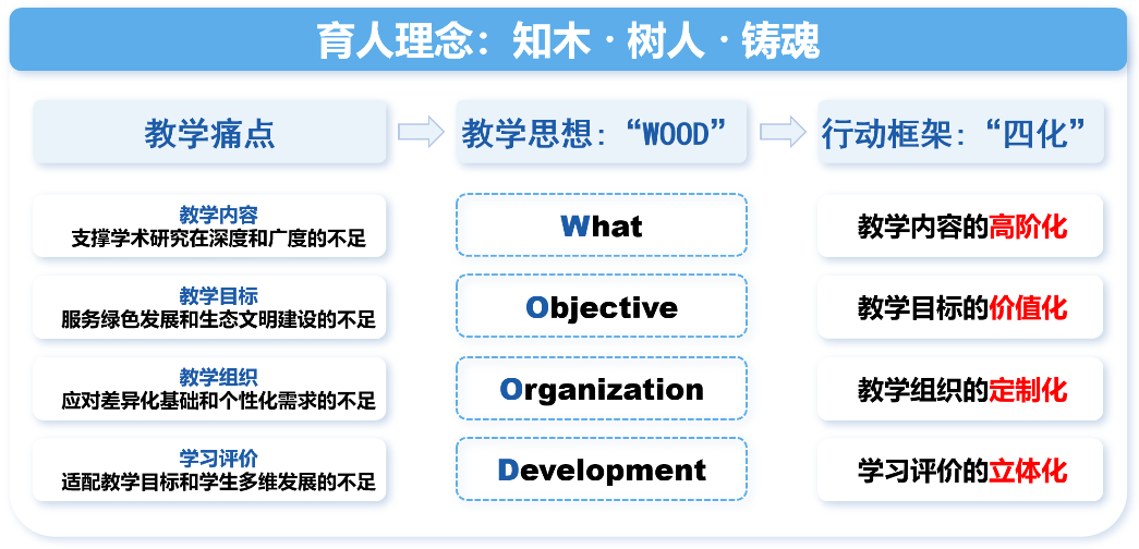 2)建立“WOOD的教学新思想,解决长期教学痛点。“W”代表“What(教什么)”,旨在通过教学内容的高阶化解决经典教学内容支撑研究生学术研究在深度和广度的不足问题;第一个“O”代表“Objectives(达到什么目标)”,旨在通过教学目标的价值化传统教学目标服务绿色发展战略和生态文明建设的不足问题;第二个“O”代表“Organization(怎么进行组织)”,旨在通过教学组织的定制化解决考常规教学方法应对学生差异化基础和个性化需求的不足问题;“D”代表“Development(如何以评促进)”,旨在通过学习评价的立体化单一学习评价适配教学目标和学生多种维度发展的不足。