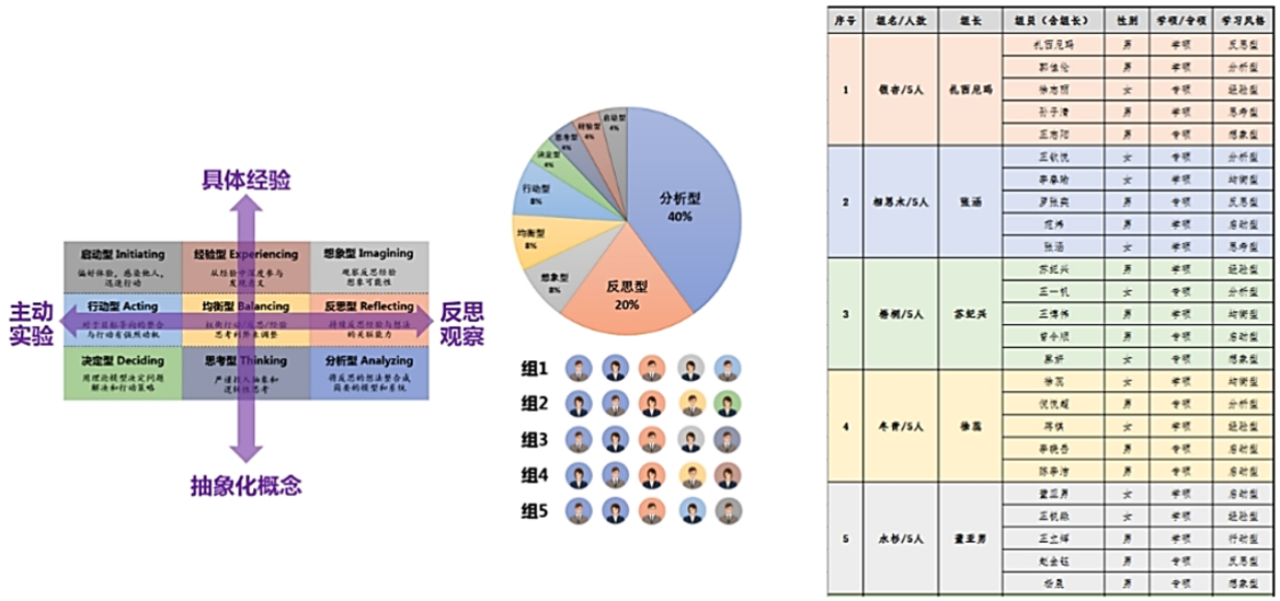 ②学习小组定制:以学情分析为支点,利用库伯学习圈理论对授课对象进行分组(图2),确保组内学习风格、学生类别、专业基础不同,充分考虑不同学生倾向于个体或团体学习、观察或实践学习的特点,通过小组学习模式开展课堂讨论与小组报告,发挥同伴学习优势,增强合作意识,调动全员积极性。