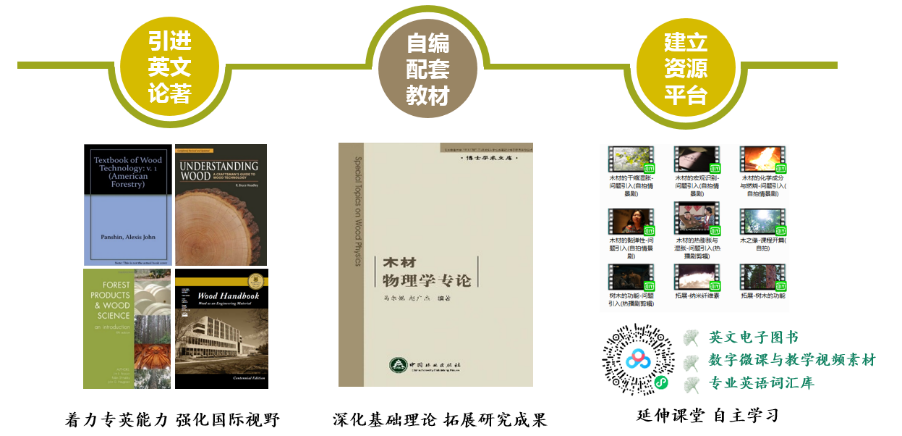 改革成果:针对课程没有配套教材的问题,授课教师编写出版了教材《木材物理学专论》,纳入了包括编者本人在内的研究成果;同时,发表了《“高等木材学”课程“教--考”三维联动人课程改革与实践》等教研论文。