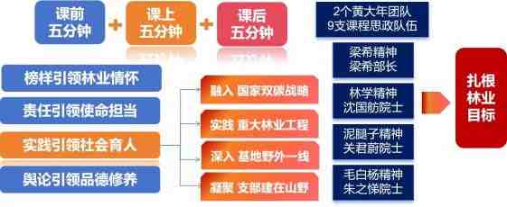 融汇“黄大年精神 ”“梁希精神 ”“林学精神 ”“泥腿子精神” “毛白杨精神 ”等林人精神,形成以“五分钟林思考 为核心的课程 到实践全过程思政模式,强化研究生知林爱林、兴林担当,引导扎根 林业一线,把精彩论文写在祖国大地上。