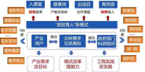 建立“双师双导 ”“派驻式 ”实践教育创新体系,形成政产学研 用“五位一体 ”育人模式。双师发展最后获批全国林业系统唯一的教 育部“双师型 ”基地,用来培养提高导师行业实践指导能力。进而由 理论与实践教学兼顾的“双师型 ”学术导师,联合实践及职业发展经 验丰富的行业导师共同构成双导师库。每个研究生必须由双导师共同 指导。行业导师和实践单位来源于政府(如国家林草局及其下属单位)、 产业(如上市公司、头部企业)和研究院所(如中国林科院、中国科 学院等)。实习中期和结束后,学生都需要提交实践报告。