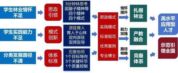 面向全球科技革命,针对国家和林草行业对林业高层次应用型人才的紧迫需求,基于我国专业学位教育制度基础和我校林学一流学科 的建设基础,以《专业学位研究生教育发展方案(2020-2025)》《教 育部关于深入推进学术学位与专业学位研究生教育分类发展的意见》 《林业硕士专业学位基本要求》等为指导,我们联合南京林业大学、 浙江农林大学等高校构建了“扎根林业 派驻育人 五维协同 ”林业专 业学位研究生培养体系,并开展了大量实践。